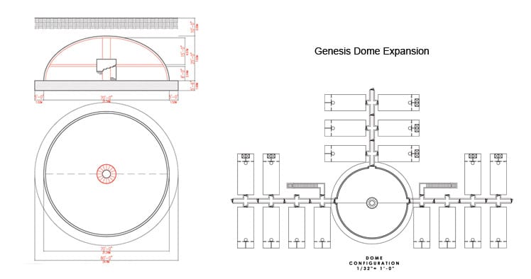 Each “Genesis” community will be comprised of 17 to 20 Genesis Pods connected to a Central “Genesis” Dome. The communities are designed to accommodate 200 people for 1 year. Occupants can choose either a suite or a communal bunk. See the Genesis Series page for layout information.